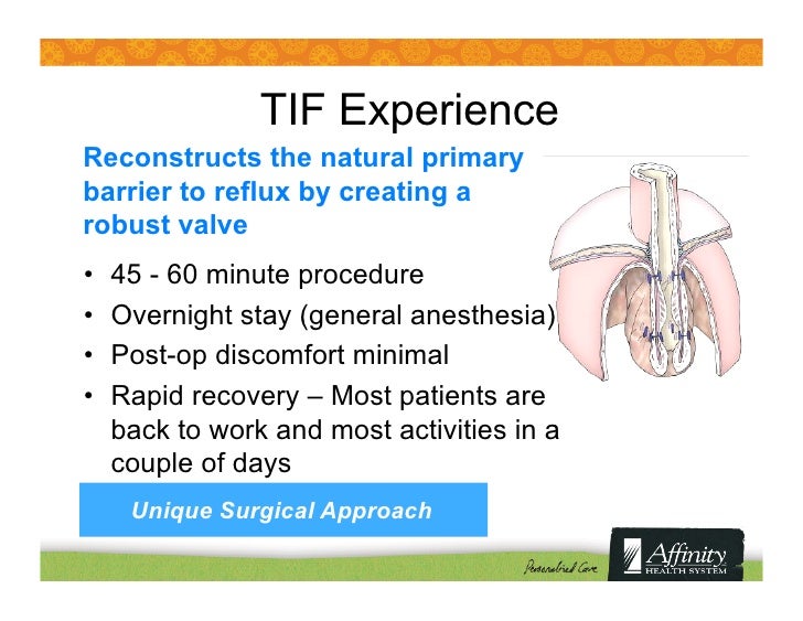 Faster recovery. TIF surgery generally lasts one hour and requires an overnight stay to monitor the “If the TIF procedure does not resolve your reflux, you can still have another procedure called Nissen fundoplication.” Nissen fundoplication involves wrapping the top of the stomach ... Fetch This Document
